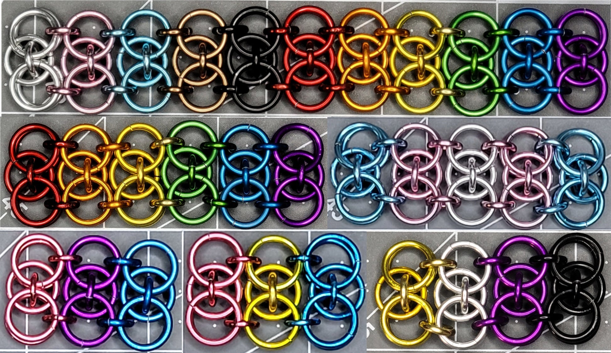 Made from anodized rings giving it a durable and lasting finish. Select a size from 18"-24". The three tone pattern gives a lot of color combinations with 23 options for each tone, or select one of our six pride options. Finish your piece with a variety of clasps and closures in 5 colors. Got a pattern in mind that not available? Just contact us at the email below and we'll work with you to get your perfect piece crafted.