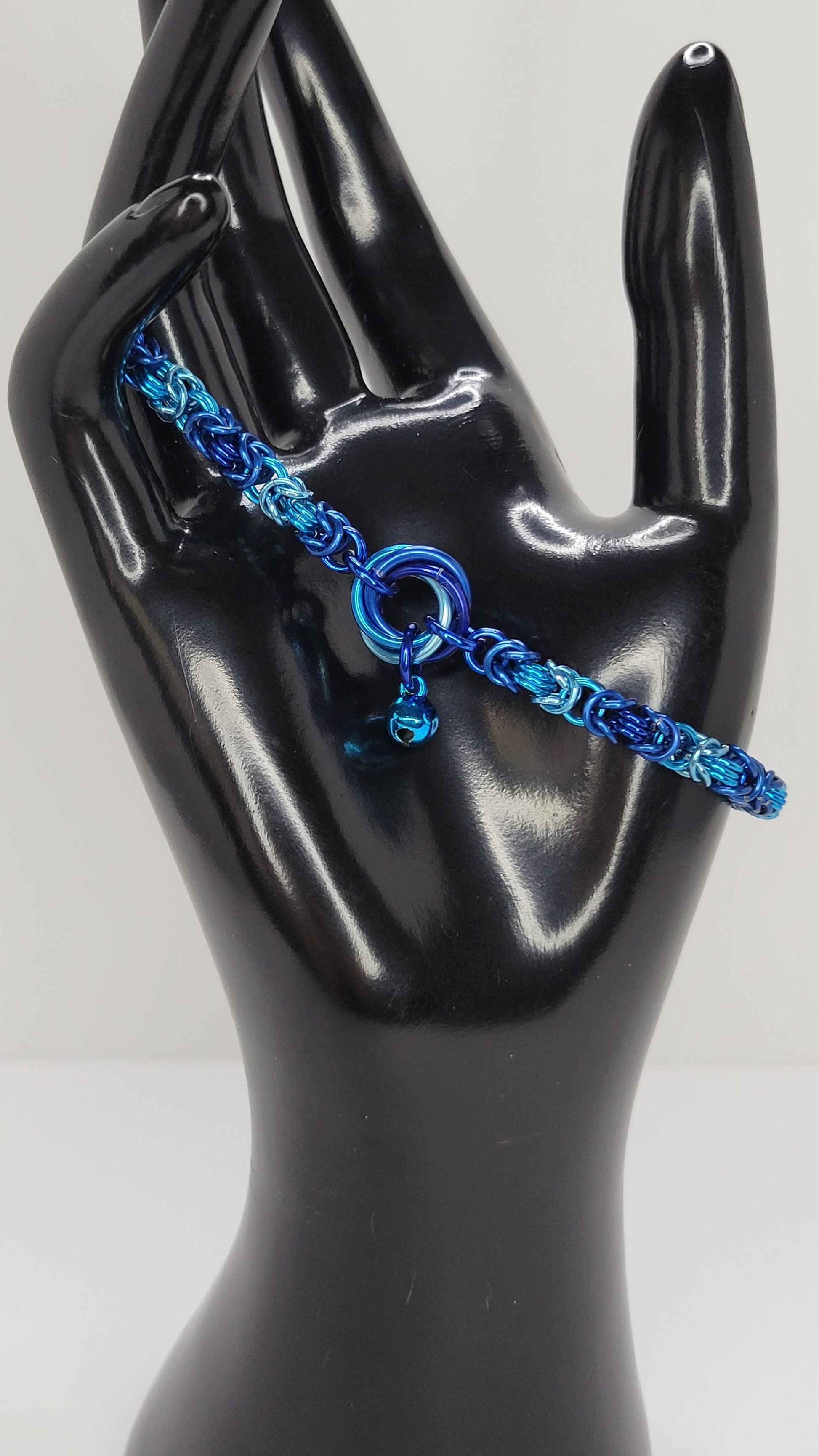 This piece shows off the blue color options available in an alternating pattern from our darkest to lightest. Measuring 9 inches and can be worn smaller. It's made of anodized metal so the finish and colors are long lasting and very tarnish resistant.