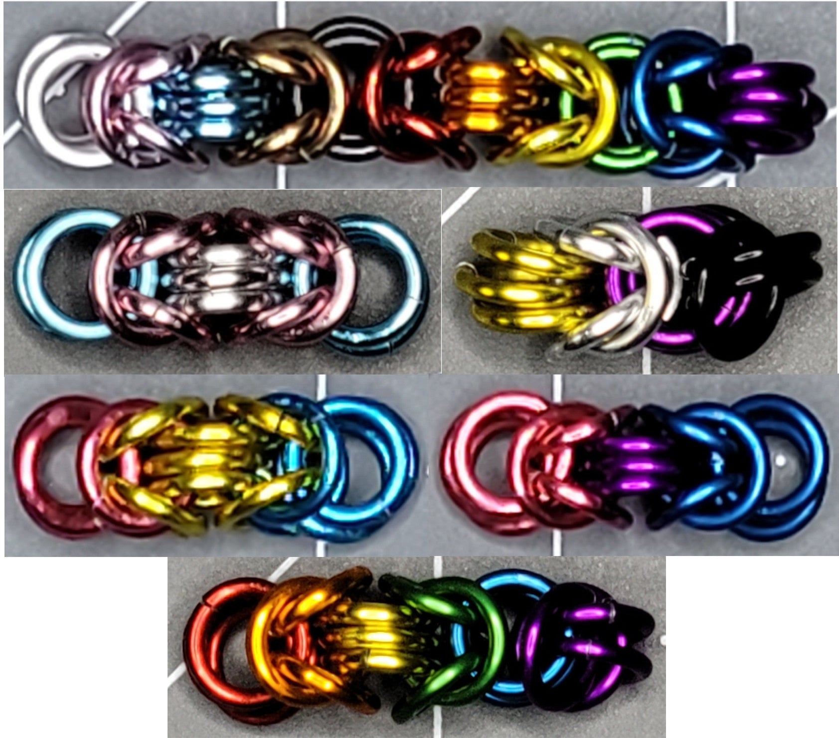 Made from anodized rings giving it a durable and lasting finish. Select a size from 12"-17". The two tone pattern gives a lot of color combinations with 23 options for each tone, or select one of our six pride options. Finish your piece with a variety of clasps and closures in 5 colors. Got a pattern in mind that not available? Just contact us at the email below and we'll work with you to get your perfect piece crafted.