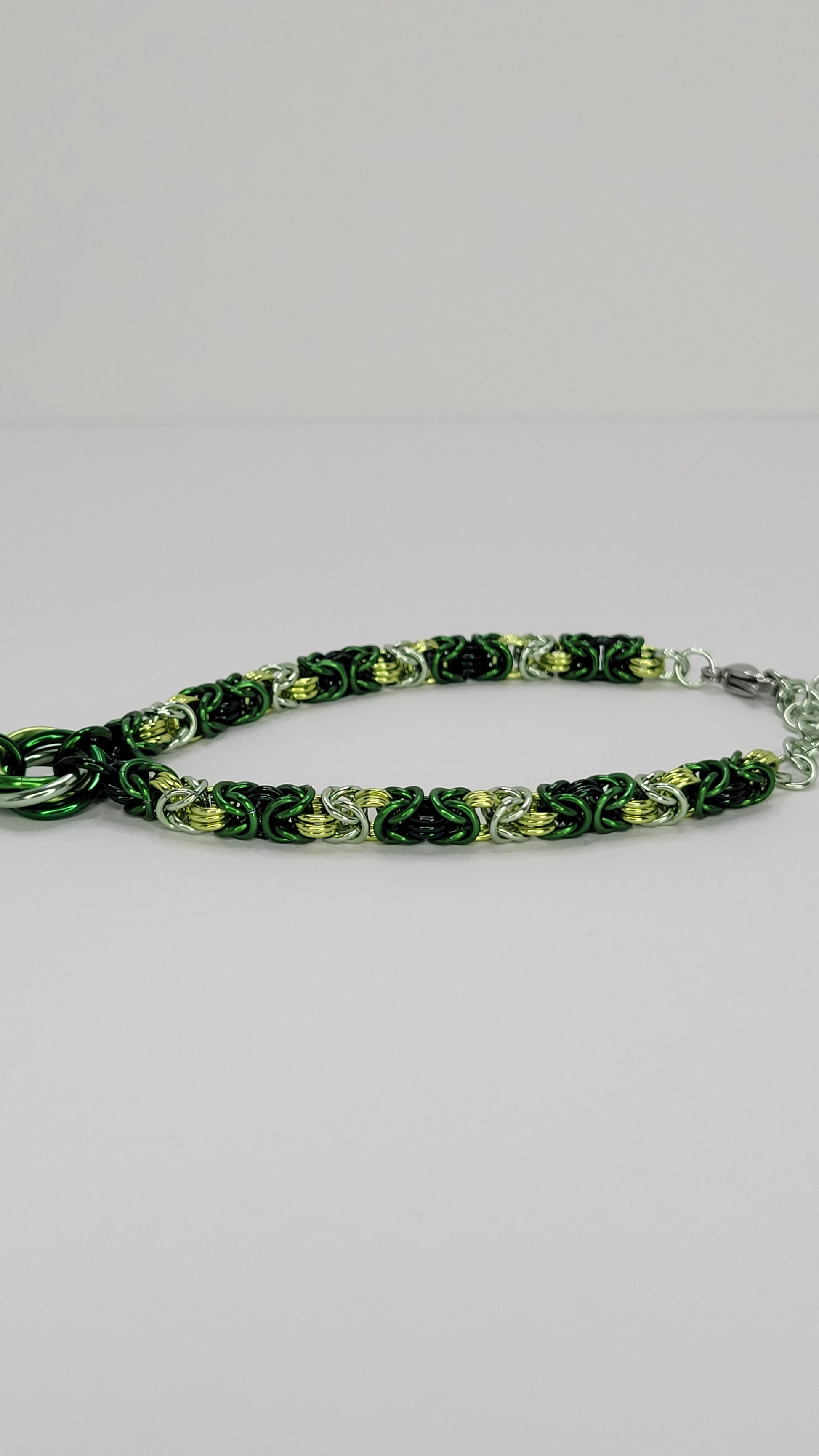 This piece shows off the green color options available in an alternating pattern from our darkest to lightest. Measuring 9 inches and can be worn smaller. It's made of anodized metal so the finish and colors are long lasting and very tarnish resistant.