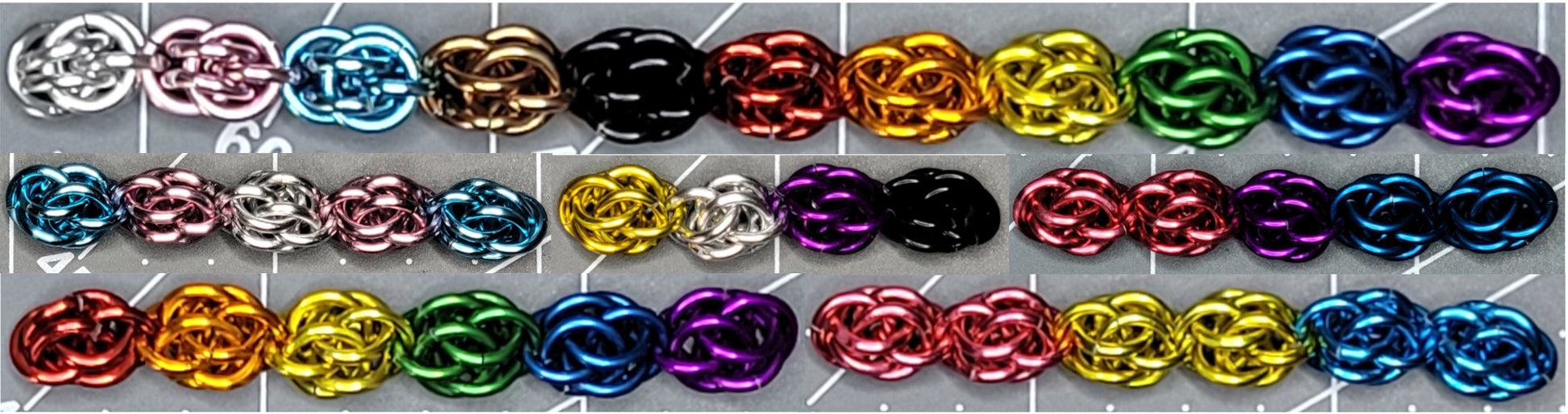 Made from anodized rings giving it a durable and lasting finish.  Select a size from 6"-11".  The three tone pattern gives a lot of color combinations with 23 options for each tone, or select one of our six pride options.  Finish your piece with a variety of clasps and closures in 5 colors.  Got a pattern in mind that not available?  Just contact us at the email below and we'll work with you to get your perfect piece crafted.